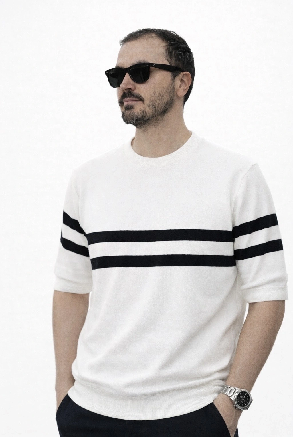 Manken 183 cm boy 68 kg üzerindeki S bedendir RENK: Beyaz BEDEN: S-M-L-XL KALIP: Likralı Rahat Kalıp KUMAŞ: %95 Pamuk %5 Lycra YIKAMA TALİMATI: 30 derece yıkama, kurutma makinesi tavsiye edilmez.