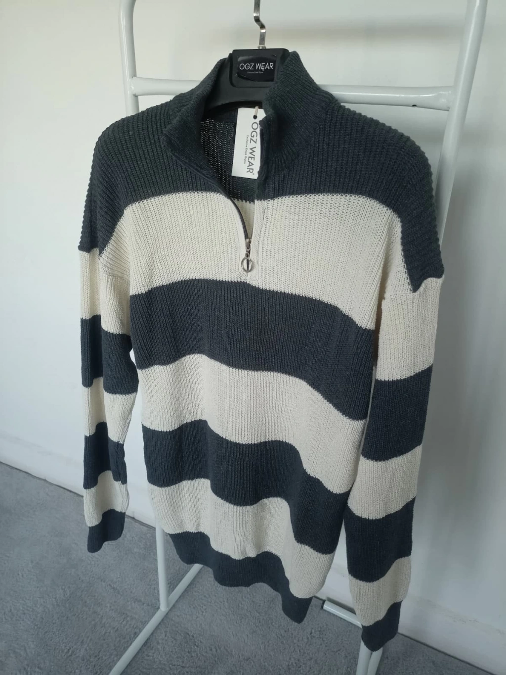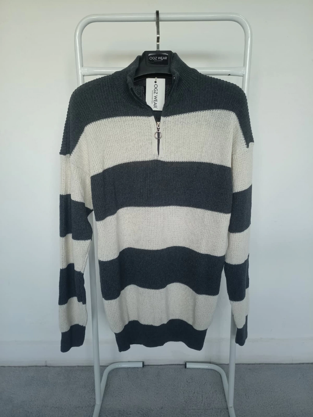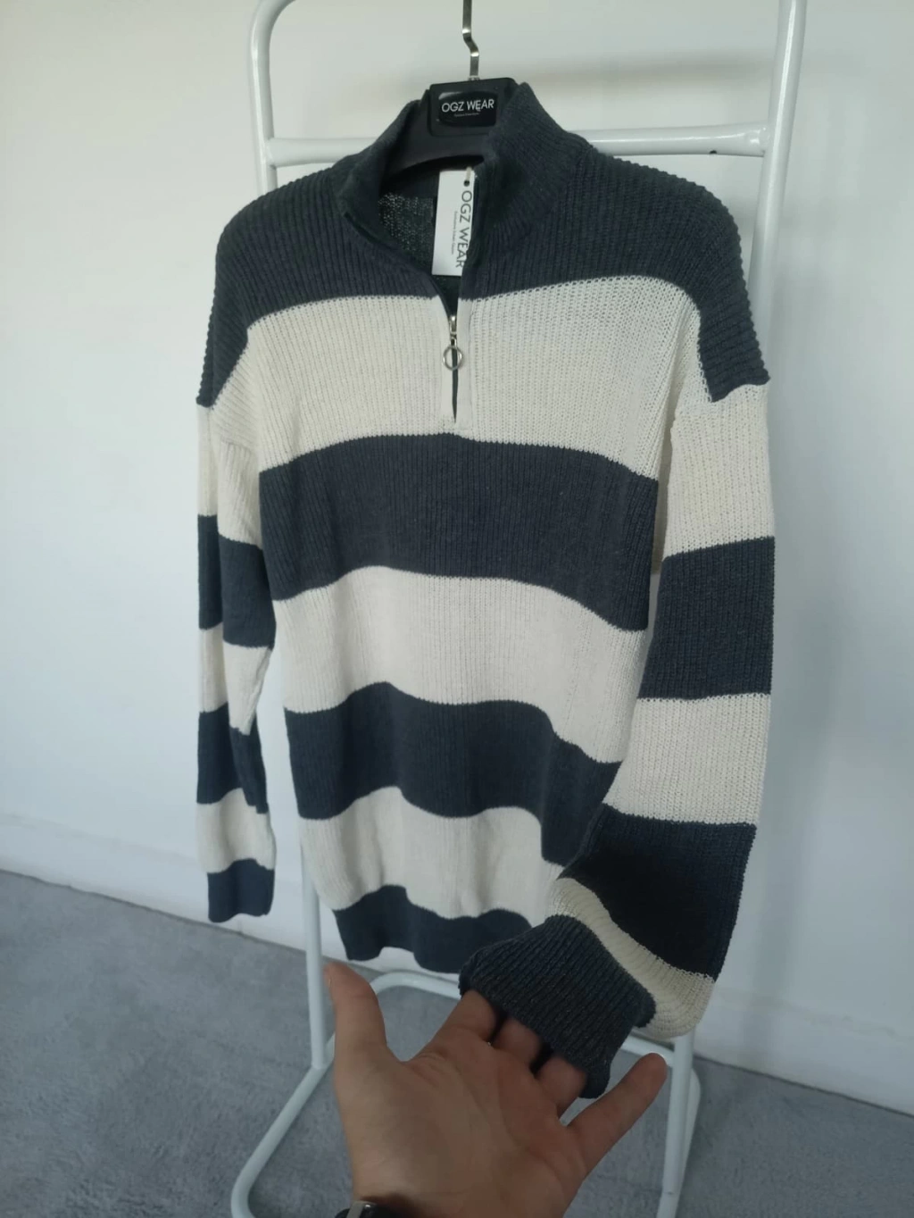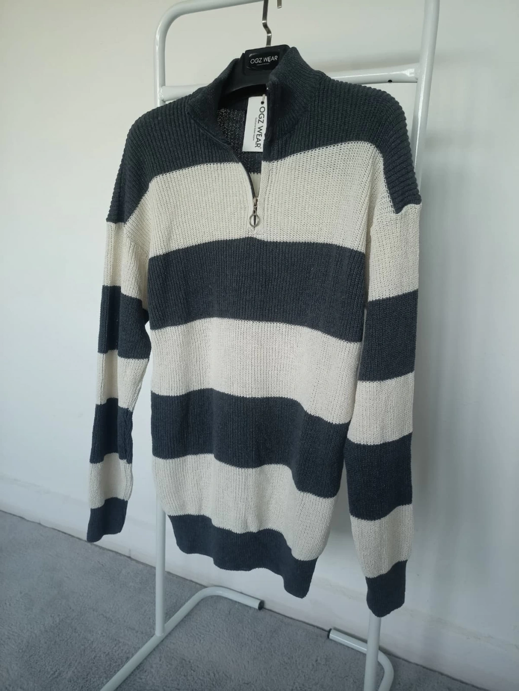 Gri Beyaz Çizgili Selanik Örgü Yarım Femuar Detaylı Uzun Kollu Triko
