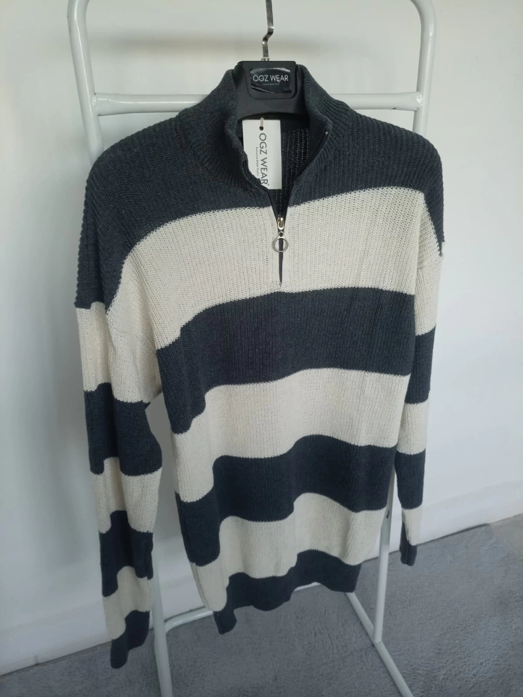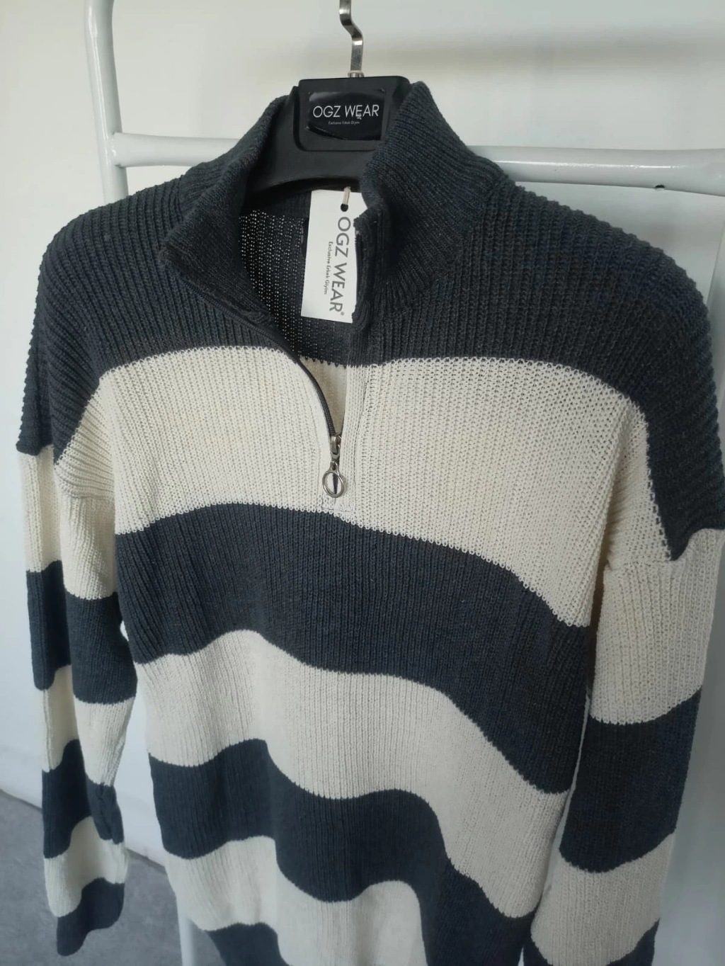 Siyah Beyaz Çizgili Selanik Örgü Yarım Femuar Detaylı Uzun Kollu Triko