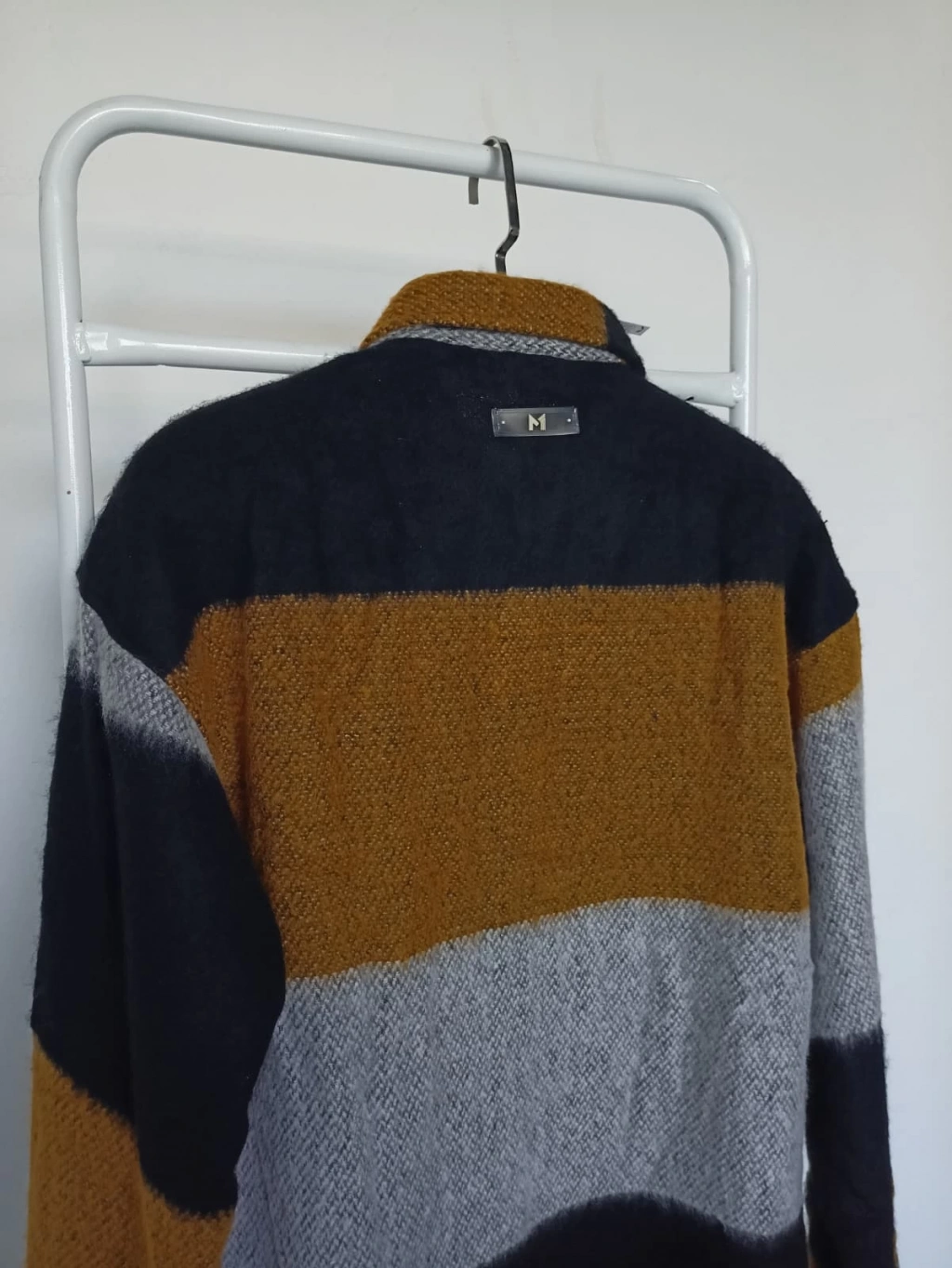 Gri Beyaz Çizgili Selanik Örgü Yarım Femuar Detaylı Uzun Kollu Triko