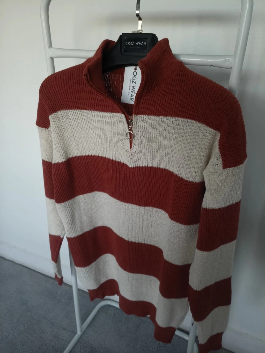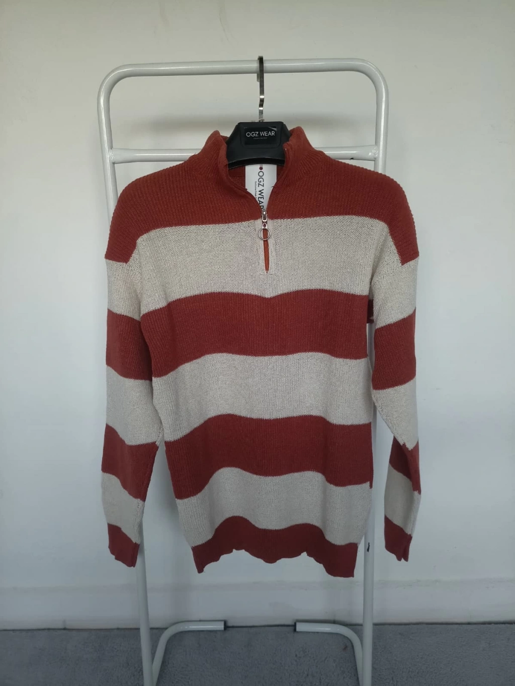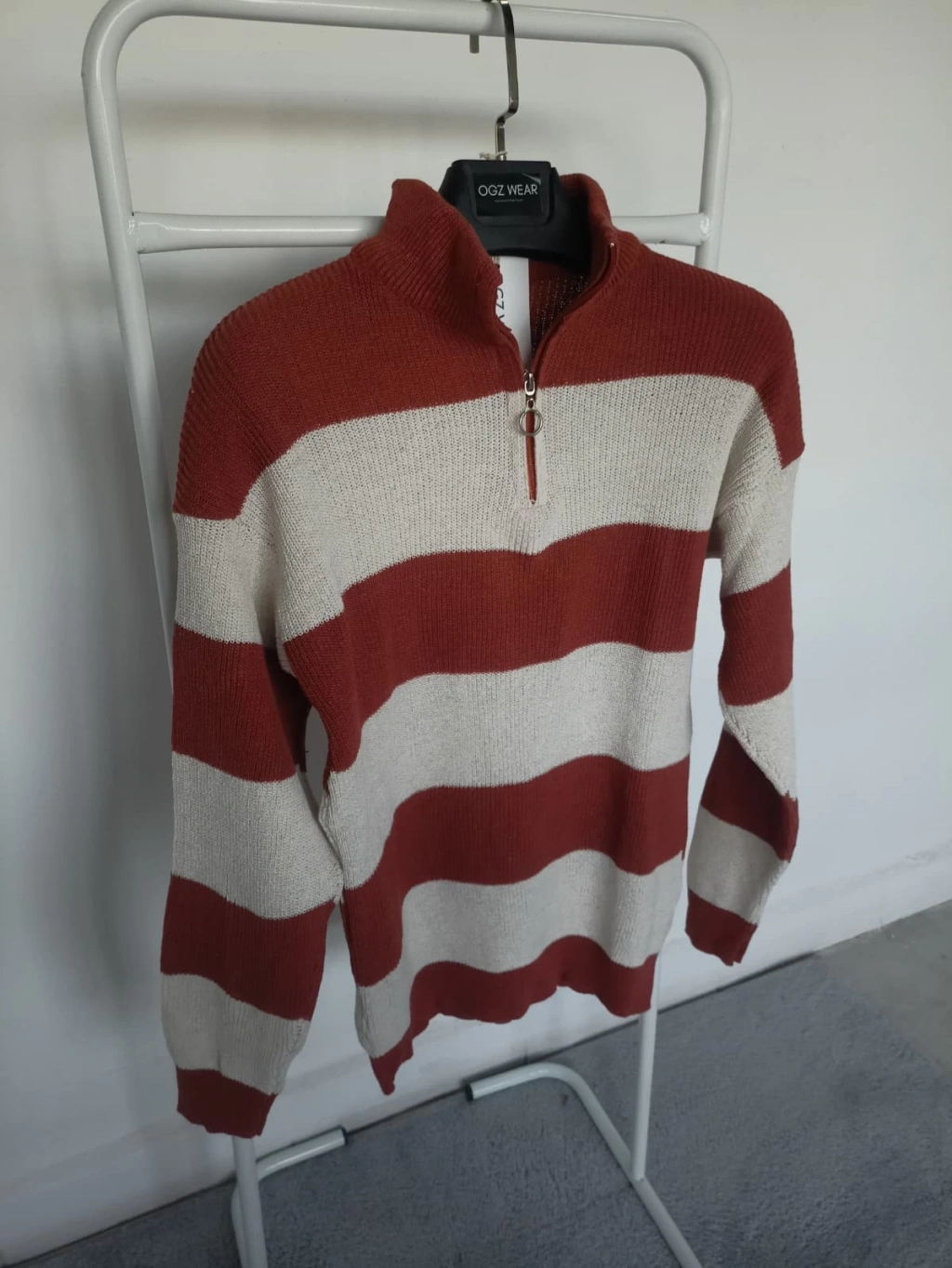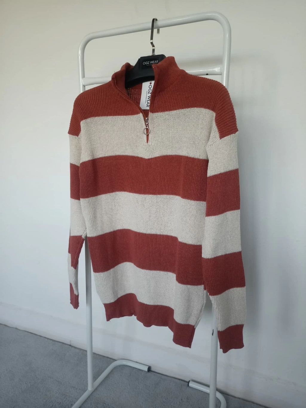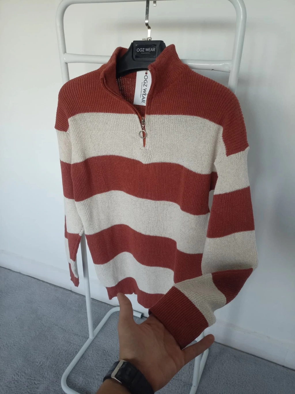 Kiremit Beyaz Çizgili Selanik Örgü Yarım Femuar Detaylı Uzun Kollu Triko